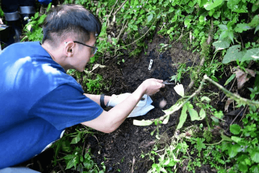 翻山沟1号点距复兴村不远,在主干公路(到瓦屋山镇)边。从公路到下方到小溪沟距离近百米,随溪形成长数百米的较平缓坡地。这一片林下也布满铜哨子。在溪边,向导配合成都理工大学队员挖开溪坎,全是铜哨子,测量厚度大于1.5米。