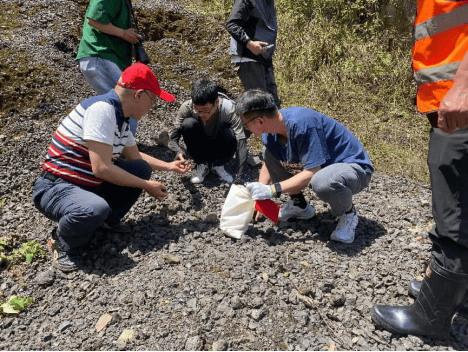 土路上行驶约3公里,到一号考察点黄秧坪的蚂蟥岗。路边堆有铜哨子上百吨。旁边有一坪,现有村民搭建的采笋棚,还有废弃的原铜渣选矿厂球磨机水泥台基。向导介绍,这个选矿厂建于2002年,因铜价下跌废于2008年,当时平均品位1.9(复兴村2003年前后建立两座铜冶炼渣摇床洗选厂。2010年通源公司在复兴村建了3个铜矿铜渣洗选)。路边铜硝子是从上方大坪楼通过留槽滑送下来的。理工大学队员们取了综合样,准备回校测平均品位等参数。