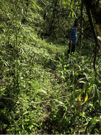 从水电站左边的水渠盖形成的平坦小路走10分钟,再往上爬林中小路5分钟,就进入带石塆超级巨大堆渣场中的4号考察点。