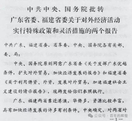 1979年7月15日,中共中央、国务院以中发〔1979〕50号文件,批转广东省委、福建省委关于对外经济活动实行特殊政策和灵活措施的两个报告