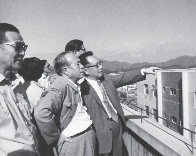 1984年,谷牧在任仲夷的陪同下,登上国际商业大厦顶楼看深圳全貌。