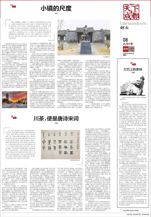 因蒙顶山茶,记住了白居易等唐人的句子。因“腊茶”,记住了宋人刘克庄的句子“老去淡生涯,虚掷年华,腊茶盂子太清些”;因早茶,记住了宋人苏轼的句子“尽日东风,荡扬茶烟”。茶史、茶事、茶艺,先有唐人,后有宋人。于是,川茶便是唐诗宋词了。