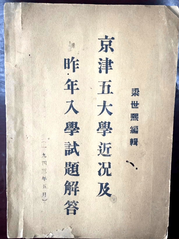 1905年,科举制废除。民国时期,随着近代教育体制确立,读书人开始依靠“高考”来“考取功名”。1938年前,大学都是采用独立自主的招生考试制度,命题也是各校自己出,那时考试比较简单,科目少,题数也少,有很多学校招生考试甚至只是一篇作文。1938年起,大学开始实行全国统一高考,按计划招生。后因全国抗战进入相持阶段,全国性统考无法组织,到1941年停止全国统一高考。南京、上海、北京等日寇占领的大学,则由日伪政府组织,各校各招。多年前,笔者在本地旧书市场淘得一本反映民国大学招生情况的史料——《京津五大学近况及昨年入学试题解答》。