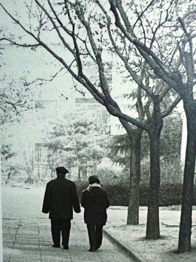 1989年,钱锺书、杨绛在北京三里河南沙沟寓所院内散步。