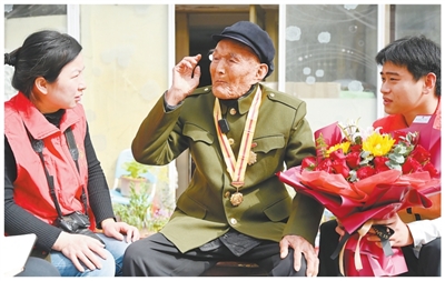 抗战老兵马凤俭向志愿者讲述革命故事。洪 星摄