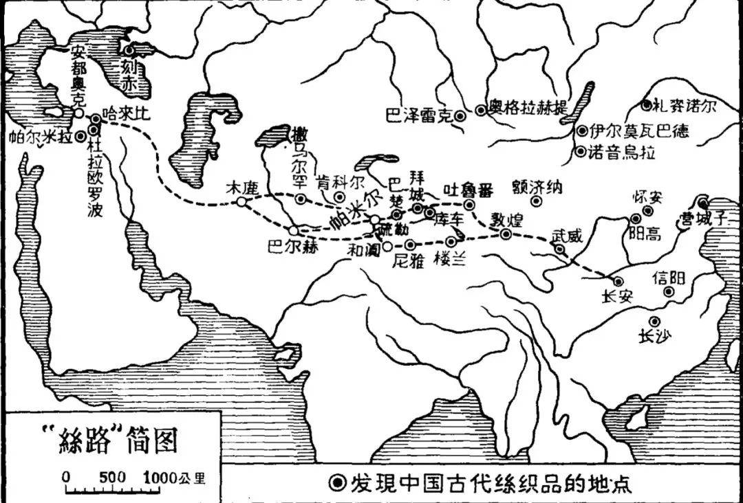 发现中国古代丝织品的地点和“丝路”简图,出自:夏鼐,《新疆新发现的古代丝织品———绮、锦和刺绣》,《考古学报》1963年第1期