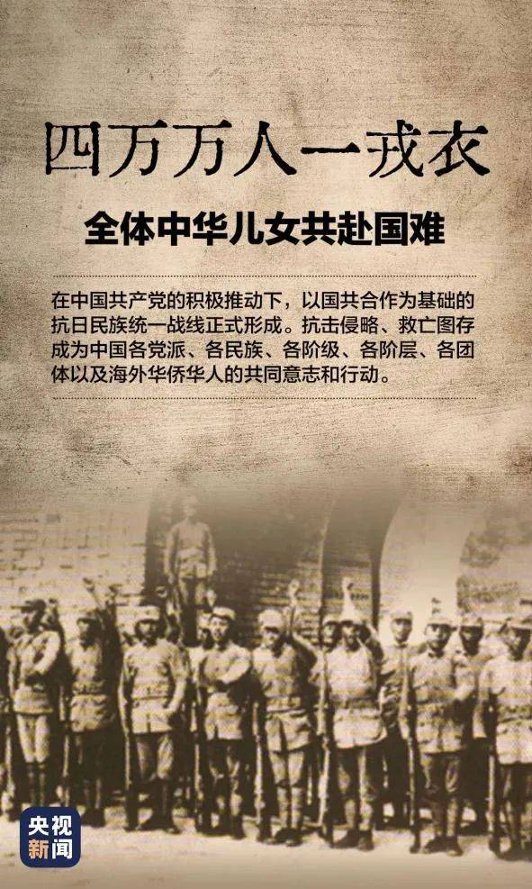 在抗日民族统一战线的旗帜下,全国各民族、各阶层、各社会团体、海外侨胞,以及一切爱国人士,都积极以各种形式参加、支援抗战。中华民族表现了同仇敌忾、万众一心的爱国主义精神,涌现了千千万万舍身救国的民族英雄。亿万同胞用生命和鲜血凝成的、以伟大的民族牺牲和历史担当为显著标志的伟大抗战精神,成为中华民族永久的精神财富。