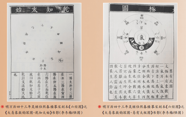 《六经图》的另一个版本体系是陈森、毛邦翰补编的抚州刻本。据苗昌言《六经图序》所载,宋孝宗乾道元年(1165),时任抚州知州的陈森“取《六经图》,命泮宫职讲肄者,编类为书,刊之于学,以教诸生”,州学教授毛邦翰等补编、监丞苗昌言校订并序之,共6卷,“凡得《易》七十,《书》五十有五,《诗》四十有七,《周礼》六十有五,《礼记》四十有三,《春秋》二十有九,合为图三百有九”。度正《性善堂稿》卷13《涪州教授陈孠由墓志铭》也有记载:“乾道间,昌元士人杨甲为《六经图》,颇便观览,好事者版行之遍天下。孠由曰:‘此乡先生之作,四方宜于此取正,而吾学无其书,可乎?’遂搜访善本,重加校正,仍命工笔札善图画者写之,刻之石,以示学者。”此本一改前人附图于书的形式,成为以图为主、以文为辅的解说六经的专门性著作。至明,新安吴继仕购得此宋本,“如获和璧”,不忍私藏,于是“一照宋板,校刻无讹”,以公诸海内。此即明万历四十三年(1615)吴继仕熙春楼刻本,凡6卷,1函6册,每半叶12行,每行23字,白口,四周单边,摹刻极真,版画精美,是现存最早的《六经图》刻本,已入选第三批《国家珍贵古籍名录》。又有明万历四十三年(1615)南京吏部刊本(又称金陵摹刻本),是本与熙春楼本同宗同源,且皆为摹刻,极似陈、毛抚州刻本。自此以后,世传刊本多由此二本出。