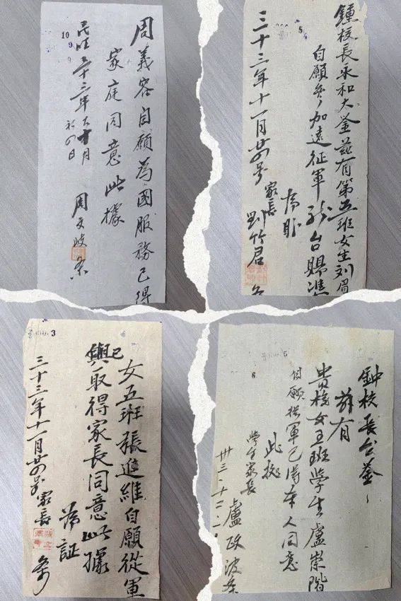 周义容、刘眉、张进维、卢崇阶4名学生报名参军,家长向四维中学校长写下的字据(内江市档案馆 供图)