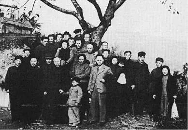 1946年2月,中共中央南方局负责人周恩来(前排左二)、董必武(前排左三)与红岩村八路军驻重庆办事处工作人员合影。