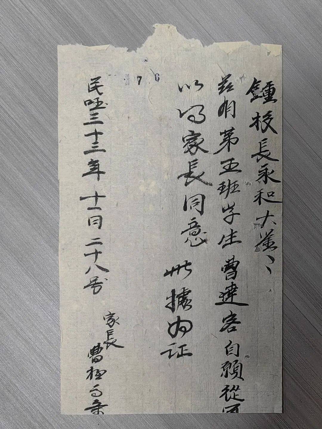 不久前,“寻亲”志愿者找到了李开明,看到黑白寸照上熟悉的面庞,他一眼认出了母亲。他也看到了外公曹极高支持母亲参军的字据。写着:“兹有第五班学生曹达容自愿从军,以(已)得家长同意。此据为证。家长:曹极高条。”