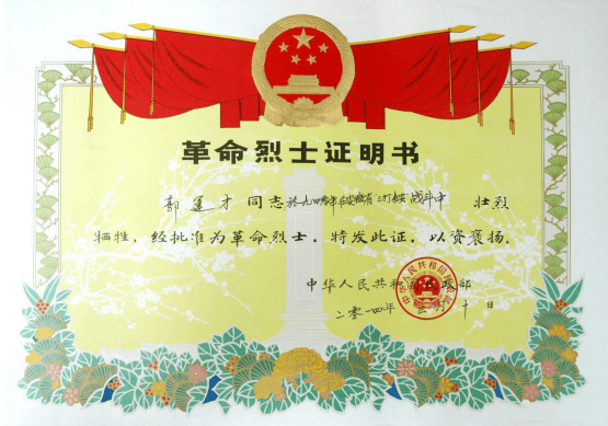 至此,爸爸强忍悲伤热泪盈眶。民政部授予郭运才革命烈士荣誉,爸爸在心里一直缅怀其胞兄,却从不领取烈士抚恤金,他心中唯有国家利益。爸爸作为一名战争中的幸存者,面对为革命牺牲的战友和亲弟弟,他已经十分知足,故从不计较个人利益及生活待遇。