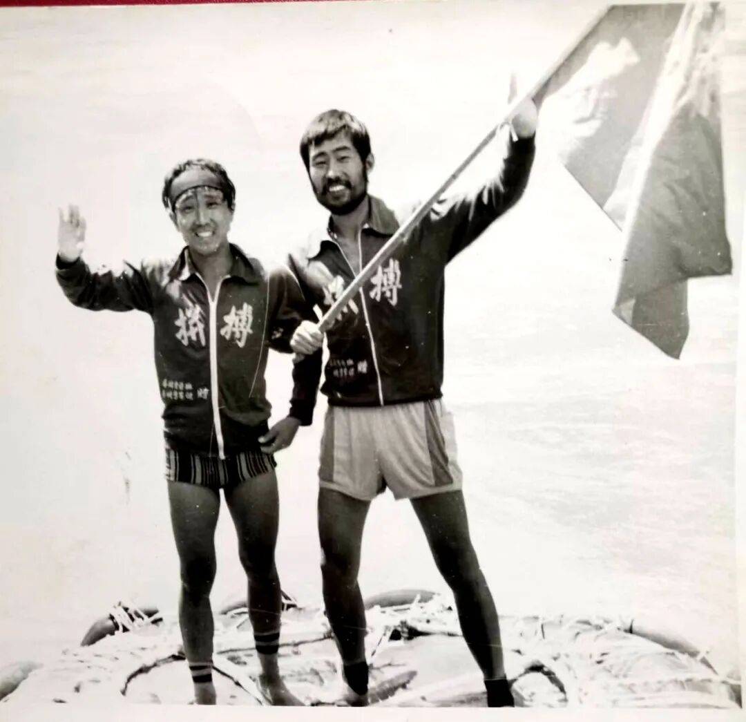 王茂军(右)与李维民闯过下虎跳峡后,站在密封船顶向江边围观的群众致意(李维民 供图)
