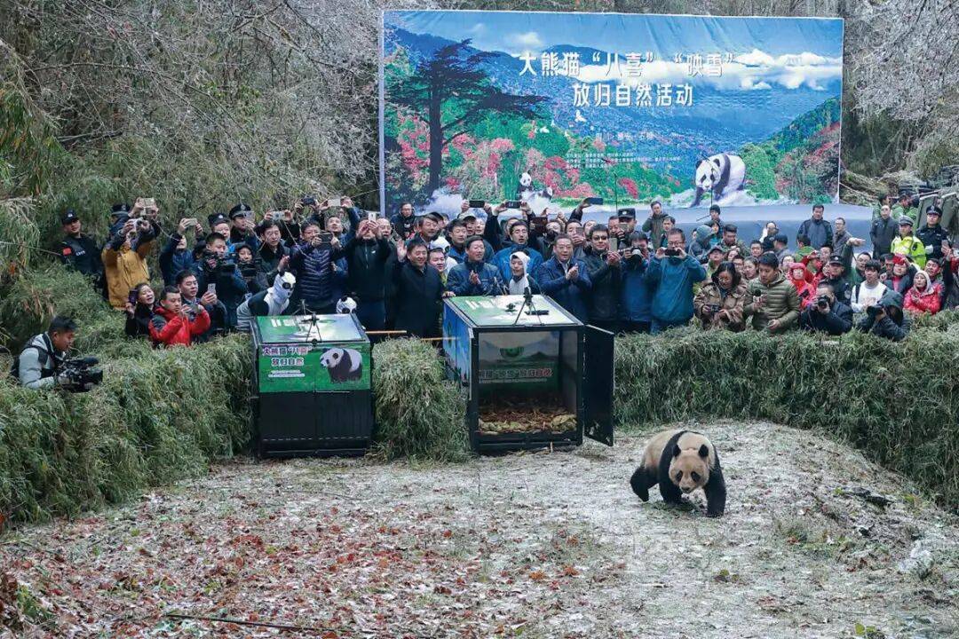 2017年11月23日,中国大熊猫保护研究中心的熊猫“八喜”“映雪”放归栗子坪保护区(石棉县地方志编纂中心 供图)