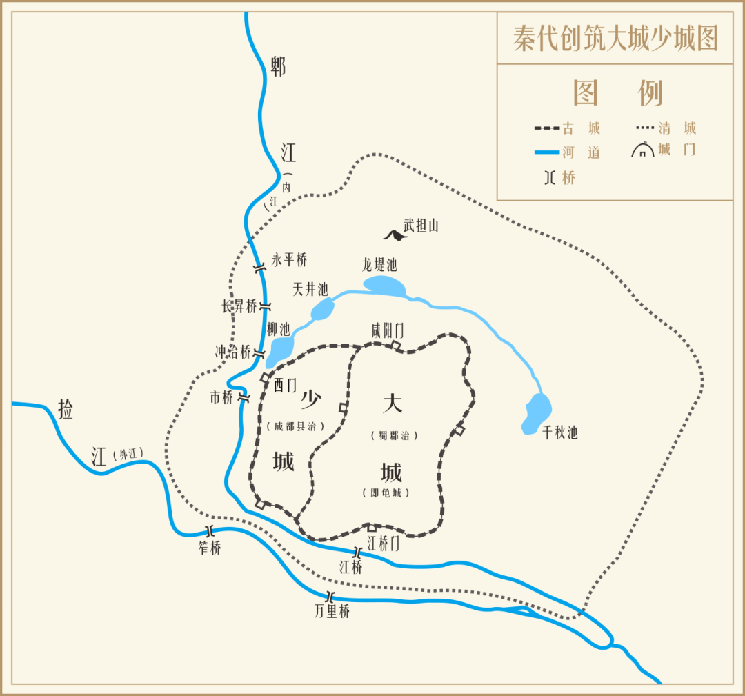 据考证,成都的秦大城有城门五道,汉大城估计有城门十三道,唐代的罗城则有八道城门, 明清时期又改为四道城门。其中南门又称江桥门,过了南门,就是万里桥。成都南门借水陆码头交通之便,使其周边生意兴旺发达,商贾云集。