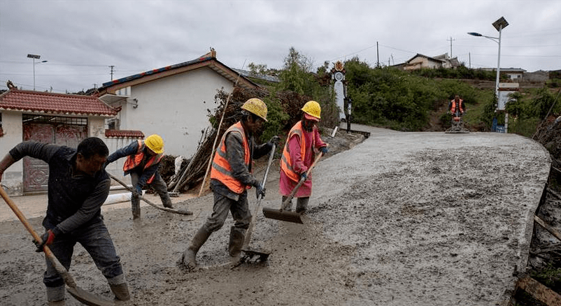 四川路桥公司的工人在金阳县依达乡保尔村对破损路面进行整治(图片来源:新华网)