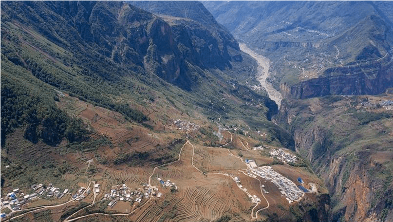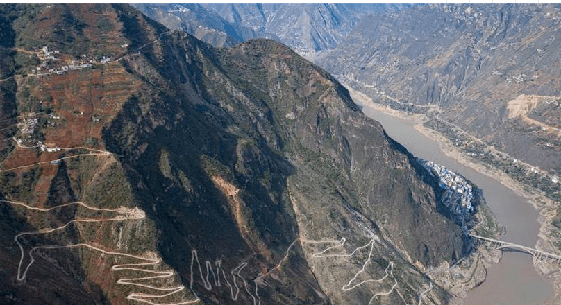 金阳县芦稿镇大湾子村,通村公路蜿蜒盘旋在金沙江峡谷悬崖绝壁边(图片来源:新华网)