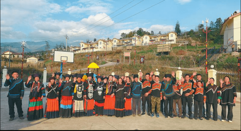2020年11月13日午后,凉山州美姑县龙门乡塔哈村,30多名群众欢聚在新居前。2019年9月,塔哈村易地扶贫搬迁项目全部建成,村民搬入花园式的两层小楼(四川日报全媒体记者 尹钢 摄)