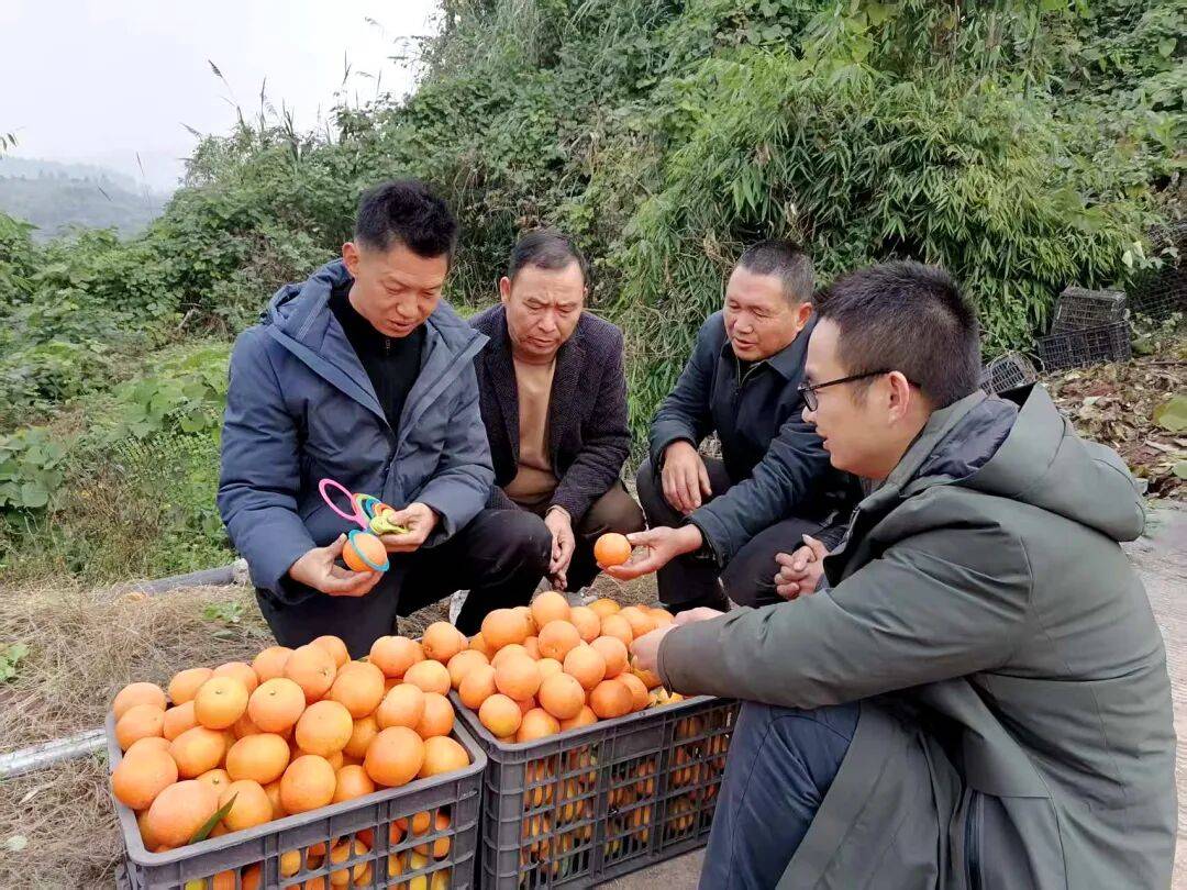 泸县返乡创业指导员朱上友(左一)在泸县太伏镇指导柑橘种植初创者如何选果
