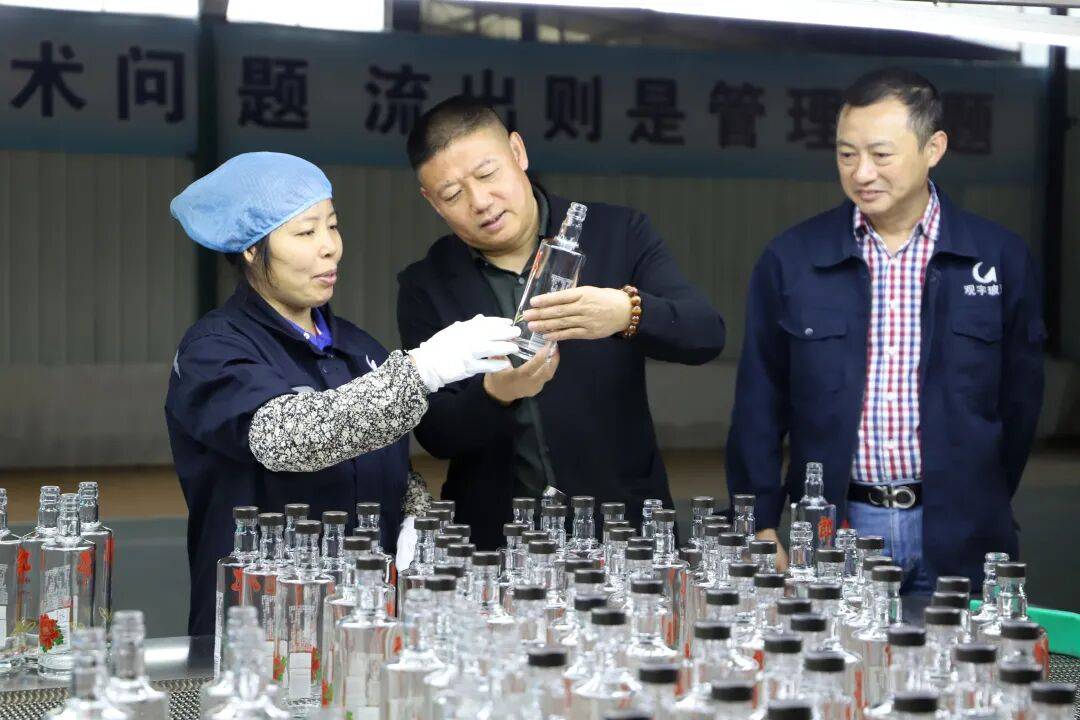 四川省返乡入乡创业明星、泸州市返创专委会副秘书长、观宇集团董事长黄云彬(左二)在生产车间指导员工