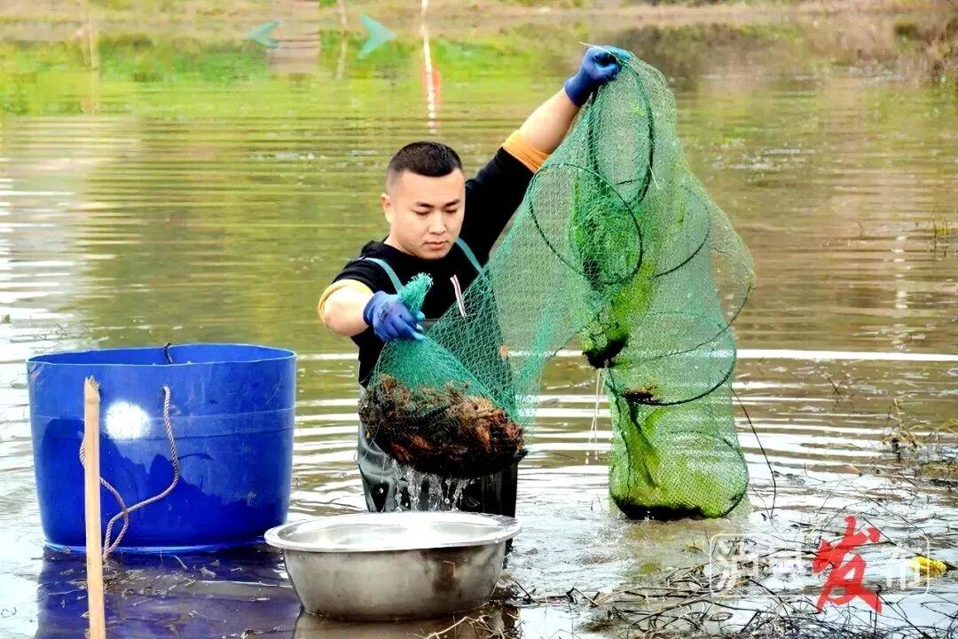 在泸县嘉明镇护松村,返乡创业青年聂利身穿劳作装备,从虾笼中收获小龙虾(图源:泸县发布)