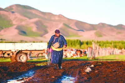 内蒙古阿鲁科尔沁旗巴彦温都尔苏木的牧民在前往夏营地前检查牛圈。新华社发