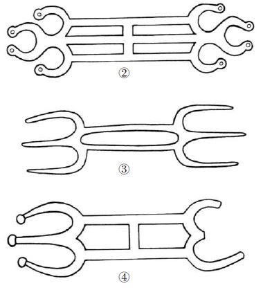 三子钗的辨识也很有意思。三子钗多为铜制,一般长15~17厘米,当中为长条形横框,两端为对称的三叉形;有些出土文物,居中的一股再分为两叉,且与两侧的两股分别弯成三个呈品字形排列的不封闭的弧圈。(图2、3、4)最开始有人把这认作搁笔的支架等物,后来在一具未被搅动的女性头骨上端出现此物,才给人启示,这可能是妇女用的发饰。