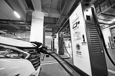 北京五棵松体育中心地下停车场的电动汽车充电站,一辆电动汽车在充电。新华社发