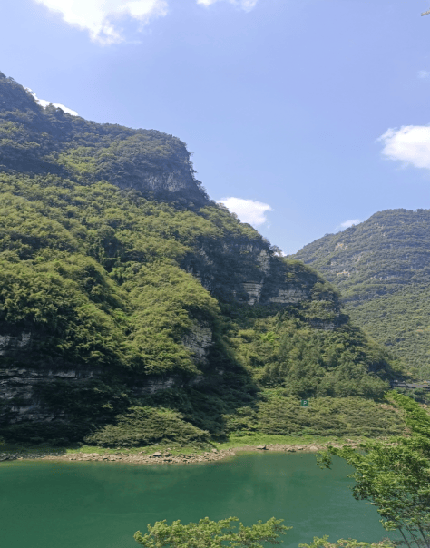 逆着江水流动的方向,往它的深处去。车围绕在沿江路慢行,一弯又一弯,窗外的风景,便渐渐换了模样。先前湛蓝的天空,渐渐被两岸陡起的山峦逼成窄窄的一绺,碧绿的山叠着青色,一层深似一层,直堆进云里。山石嶙峋,仿佛远古的巨人用斧头随意劈削而成,带着一种未加修饰而苍茫的劲儿。而乌江,就在这万丈绝壁的夹缝里流淌着。