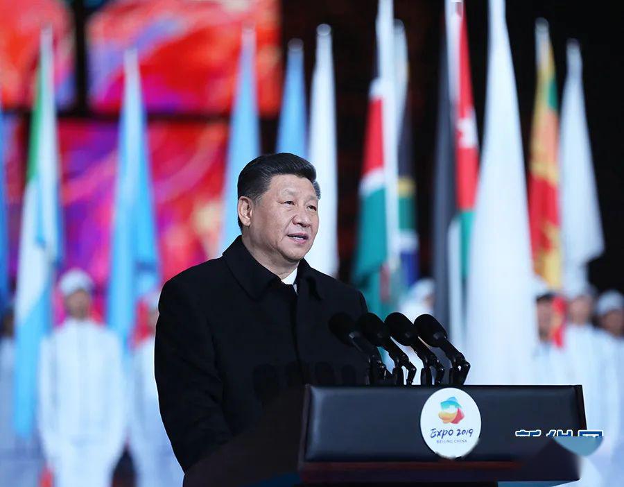 2019年4月28日,国家主席习近平在北京延庆出席2019年中国北京世界园艺博览会开幕式,并发表题为《共谋绿色生活,共建美丽家园》的重要讲话(新华社记者 鞠鹏 摄)