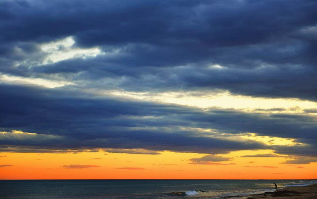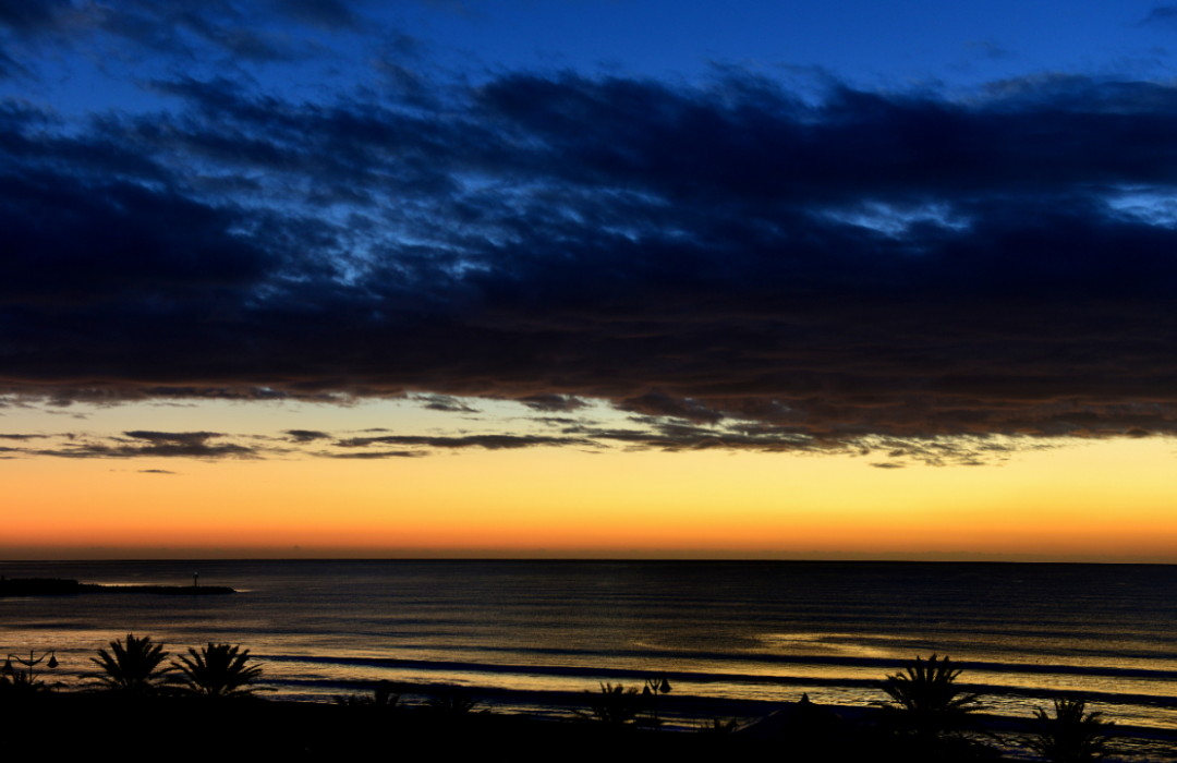 眼看暮色苍茫,情急之下,我顾不上提行李、领房卡,只好托同行的家人和朋友代劳,一个人匆忙小跑奔向海滨沙滩。但见深蓝的海面已趋于平静,而碧海深处的天际,色彩的组合与变化令人称奇:当地时间大约下午6点,虽然不见红日亲吻大海的美景,但仍见大海尽头一片橙色的天空,红红的,纯然一色;而橙红天空的上端,则布满了厚厚的墨蓝的云层,面积之广、气势之大,令一抹橙红的霞光因抵挡不住而甘拜下风似的,大有“山雨欲来风满楼”、“黑云压城城欲摧”之势。这一场景,把黄昏的地中海风云演绎得淋漓尽致。于是,我便迫不及待地端起心爱的尼康D800,选拍了两张海上夕照。