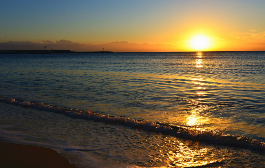 大约10分钟后,地中海上空的云层逐渐发生了变化:天空的鱼肚白渐变成了淡紫、微红、灰蓝、金黄——这些不同的色彩,有如调色扳的巧妙布局。随着时间一秒一秒地推移,渐渐地,一轮崭新的红日,拖着一缕缕橙色的海水,缓缓地跳出海面。开始像一盏扁圆的宫灯,慢慢地逐渐变圆,又渐渐地再有了阳光,这些金色的阳光又慢慢由弱变强,由短变长。这时,游人越来越多,只见银白的沙滩变成了金色的沙滩,海水的颜色也由深变浅,波光鳞鳞,一望无垠。