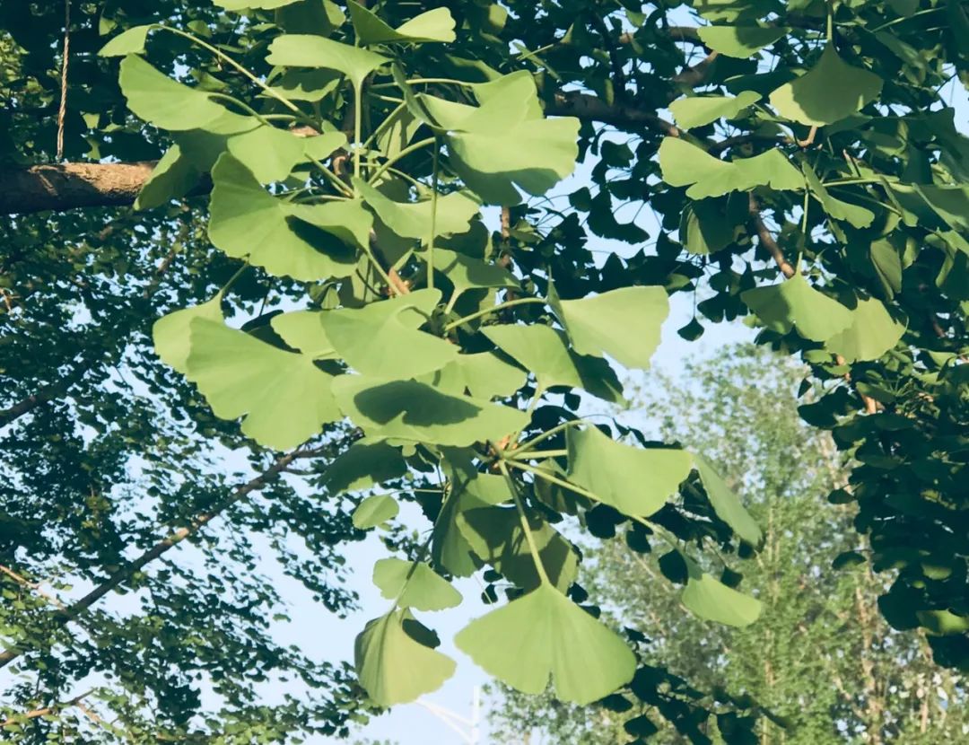 银杏树的绿叶别具一格,叶片上布满了皱褶,立起来看像把扇子,倒过来看像条裙摆,把两片叶子组合在一起又像是一只翩翩起舞的蝴蝶。叶片的边缘呈不规则的波状,中间凹入。有细长的叶柄和二叉状平行叶脉,极易从纵向撕裂。听说,这种树叶具有活血化瘀,通络止痛,敛肺平喘,化浊降脂,抗菌解毒,增强免疫力的功效。我在帮血气方刚的大学生拍摄了合影照之后提示他们,不妨每天采撷三两片银杏叶泡水喝,这样对健康有益。
