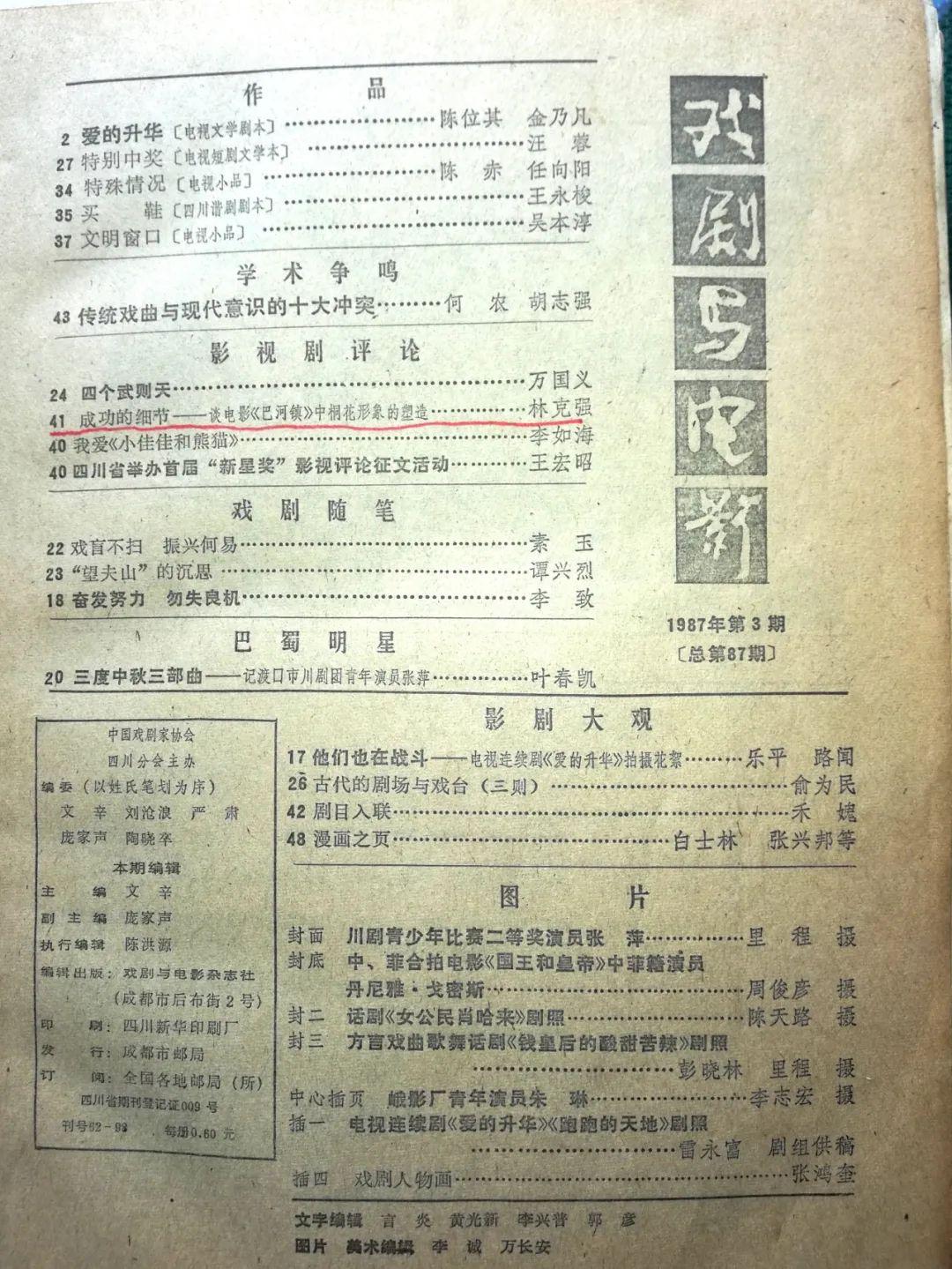 《戏剧与电影》1987年第3期发表《成功的细节——谈电影〈巴河镇〉中桐花形象的塑造》(作者供图)