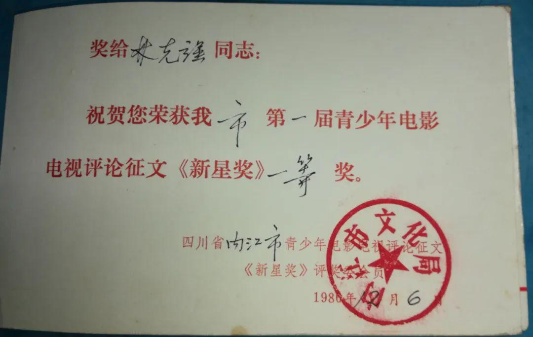 完稿后,我将文章邮寄到内江市影评征文办公室,交了作业就不管了。没多久,我接到通知,眼睛亮了,竟然获一等奖。纯属侥幸意外,有点受宠若惊,我原以为能获个三等奖优秀奖什么的,没料到会获一等奖。当然,影评获奖,并非空穴来风,因为70年代和80年代初,我已在《四川日报》《重庆日报》上发表过几篇电影观后感了。