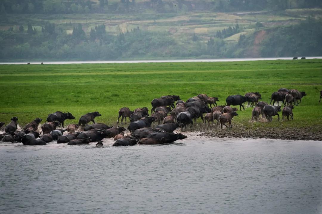 蓬安县相如镇油房沟村,百余头水牛横渡嘉陵江到江心岛吃草(李向雨 摄,图片来源:四川日报)