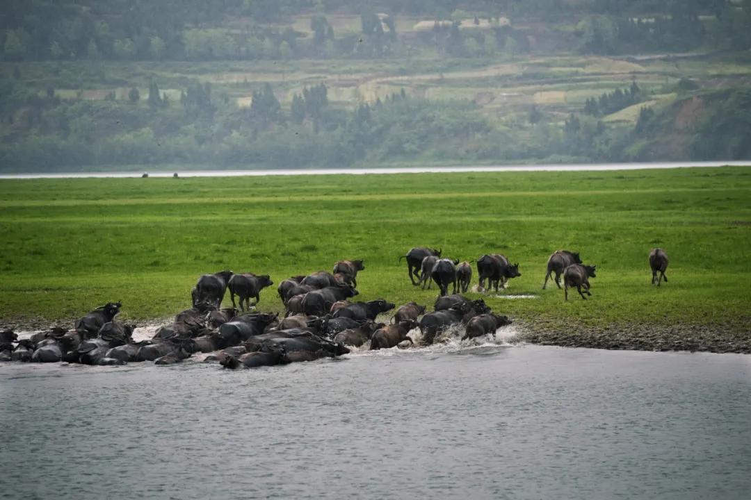 紧赶慢赶,车辆、人群把油坊沟口堵得水泄不通。脚一点点向前挪移,眼睛四处张望寻找有利地形。几经周折,终于利用身体娇小的优势,觅得江边护栏一空隙站定。“哞…哞…哞”,牛棚里的水牯牛一声声此起彼伏地吼叫着。它们焦躁不安,有的伸出前蹄叩打牛栅栏,有的用牛角顶撞牛栏,想早点冲出去。“嘘…嘘…嘘…嘘”,只听几声哨音响起,一大群饿极了的牛撒开蹄子冲向江边。虽然急切,但它们似经过严格训练的小学生一样,不拥挤,不插队。高大威猛的头牛先侦查“敌情”,确认前边没有危险,然后扭头慈祥地看看它的牛队,自己率先慢悠悠下水,后面的牛群才紧跟着下去。