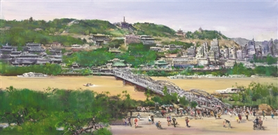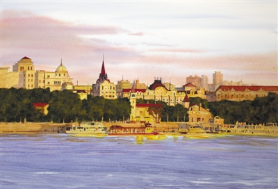 赵云龙水彩画《松花江之夏》:夏日阳光为岸边的建筑披上金色轻纱,碧波之上,点缀一两艘快艇,这一抹诗情画意般的妩媚,恰是哈尔滨这座“冰城”夏日独特的风情。