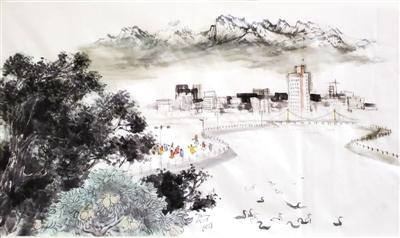 郐振明、王钧兵中国画《天山下的孔雀河》:孔雀河穿城而过,成为库尔勒市一道亮丽的风景。清波粼粼,河中天鹅嬉戏游弋,岸上人们歌舞相伴,天山脚下生动的画面,是最美的生活图景。