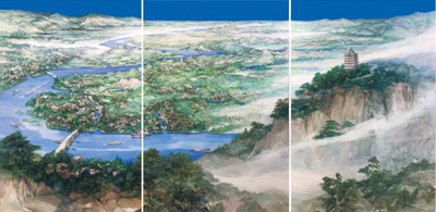 罗江中国画《盘龙江》:盘龙江如同一条游龙,自北向南穿越昆明市,哺育这方水土,赋予这座“春城”灵性。随着盘龙江绵延不息的流淌,历史与发展交织、美景与生活共歌。