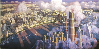 李朝华油画《黄浦江》:从昔日滩涂一片,到而今大厦林立,一江一河,大开大合的城市格局内含着开放、创新与包容的精神。大江奔腾,既目睹了上海的沧桑巨变,又照见这颗“东方明珠”的广阔未来。