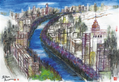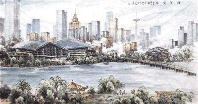 冷旭中国画《浑河览胜》:从城郊河变为城内河,古老的浑河不断为沈阳注入生机。两岸休闲空间让人们乐享生活,岸边的盛京大剧院等新人文景观让城市更具魅力。
