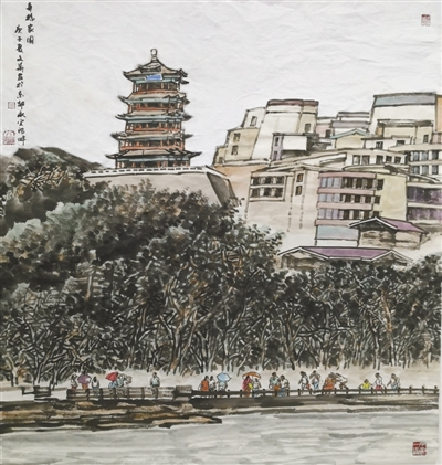 徐国雄中国画《木兰溪畔》:河水潺潺,岸边青绿,错落有致的建筑、石椅、亭榭和健身道,构筑滨水新空间。作为莆田人心中最美家乡河,悠悠木兰溪承载着乡愁,奔涌着希望。