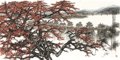 马新林、梁腾中国画《广济春深》:潮州古城东门外,横跨韩江之上的广济桥,以“十八梭船廿四洲”的格局成为潮州八景之一。江水汤汤,古老的广济桥以其独特风姿惊艳了岁月,昔日“一里长桥一里市”的活力继续释放。