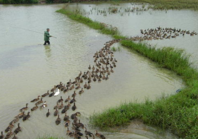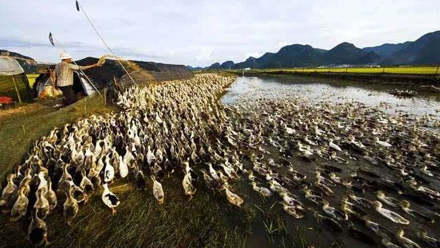 每到一个有水塘或水田的地方,养鸭人会将鸭群赶进水里。鸭子们到水里以后,便四散开来,一个个将头扎进水里捕鱼吃。鱼塘里、水田上不时传出鸭子兴奋的嘎嘎声。勃勃的生机,在整个山谷之中,像水的涟漪一样,一圈一圈地荡漾开来。