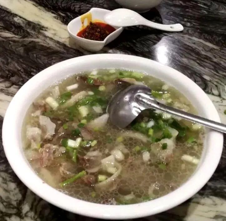 隆昌羊肉汤熬得雪白浓酽,汤里的羊肉、羊杂、羊血做得很精致,入口化渣。在汤里撒上点葱花,用豆瓣酱蘸食羊肉、羊杂,感觉肥而不腻,无膻味,十分可口。