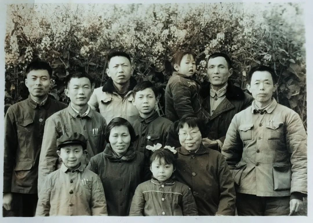 1978年3月,在油菜花盛开的校园,作者(图中)及作者母亲(右二)等和恩师们合影留念