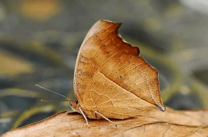 另外,在报国寺、长老坪、善觉寺、万年寺、清音阁一带,也可见到枯叶蝶的身影。其实在1980年之前,川西南山区如瓦屋山、青城山也常见枯叶蝶。仔细观察,它停息之时,两面“三刀翅”紧紧收缩竖立,将身子深深地隐藏,展示出翅膀的腹面。这种隐身术远远高于鸵鸟埋沙,因为它腹面全是古铜色,在秋天酷似一片枯叶,且常常随着季节的更替而变化,色彩和形态都和树叶无异。一条纵贯前后翅中部的黑色条纹和细纹,很像树叶的中脉和支脉;后翅的末端拖着两条和叶柄十分相似的“尾巴”,静止在树枝上,很难分辨出蝶与叶。